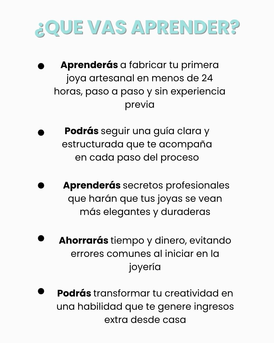 Está diseñado para principiantes totales. Te llevamos paso a paso para que en menos de 24 horas tengas tu primera joya terminada (y ese brillo de orgullo en los ojos). 💎